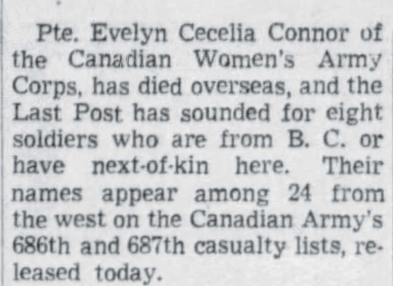 Evelyn Cecelia Connor was the daughter of James and Elizabeth Connor of 924 Ellery Street, Esquimalt, British Columbia. Her father was Irish and her mother: English. There were seven children in the family: two more daughters, Mary June "Jenny" and Elizabeth and four sons, Martin, Victor, Maurice, and James. Evelyn was the youngest. The family was Roman Catholic. James, 28 years old, enlisted in the Royal Canadian Navy.